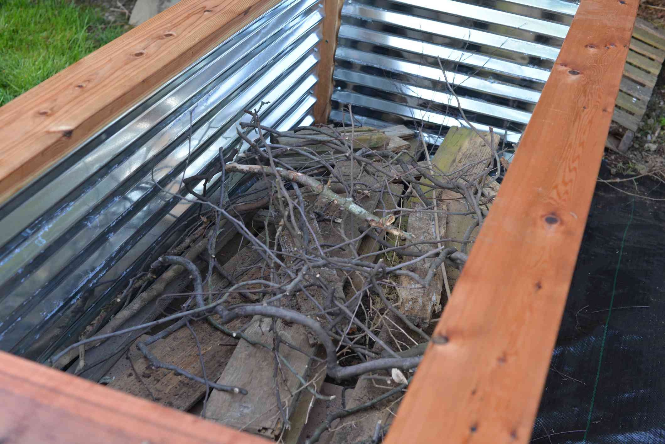 Одним із найбільш економічних методів є використання колод або гілок від повалених дерев. Дебора ДеСальво з Cold Brook Farm демонструє цей підхід, заповнюючи нижні шари своїх піднятих грядок секціями колод довжиною 60-90 см. Цей метод вимагає обережності : уникайте використання деревини від дерев, що проростають, таких як верба або платан, які можуть укорінюватися повторно. Колоди поступово розкладаються, збагачуючи ґрунт поживними речовинами, але також призводять до осідання рівня ґрунту, що потребує щорічного підсипання. Гілки, будучи меншими, розкладаються швидше та забезпечують кращу аерацію, хоча для полегшення розміщення їх необхідно попередньо нарізати.